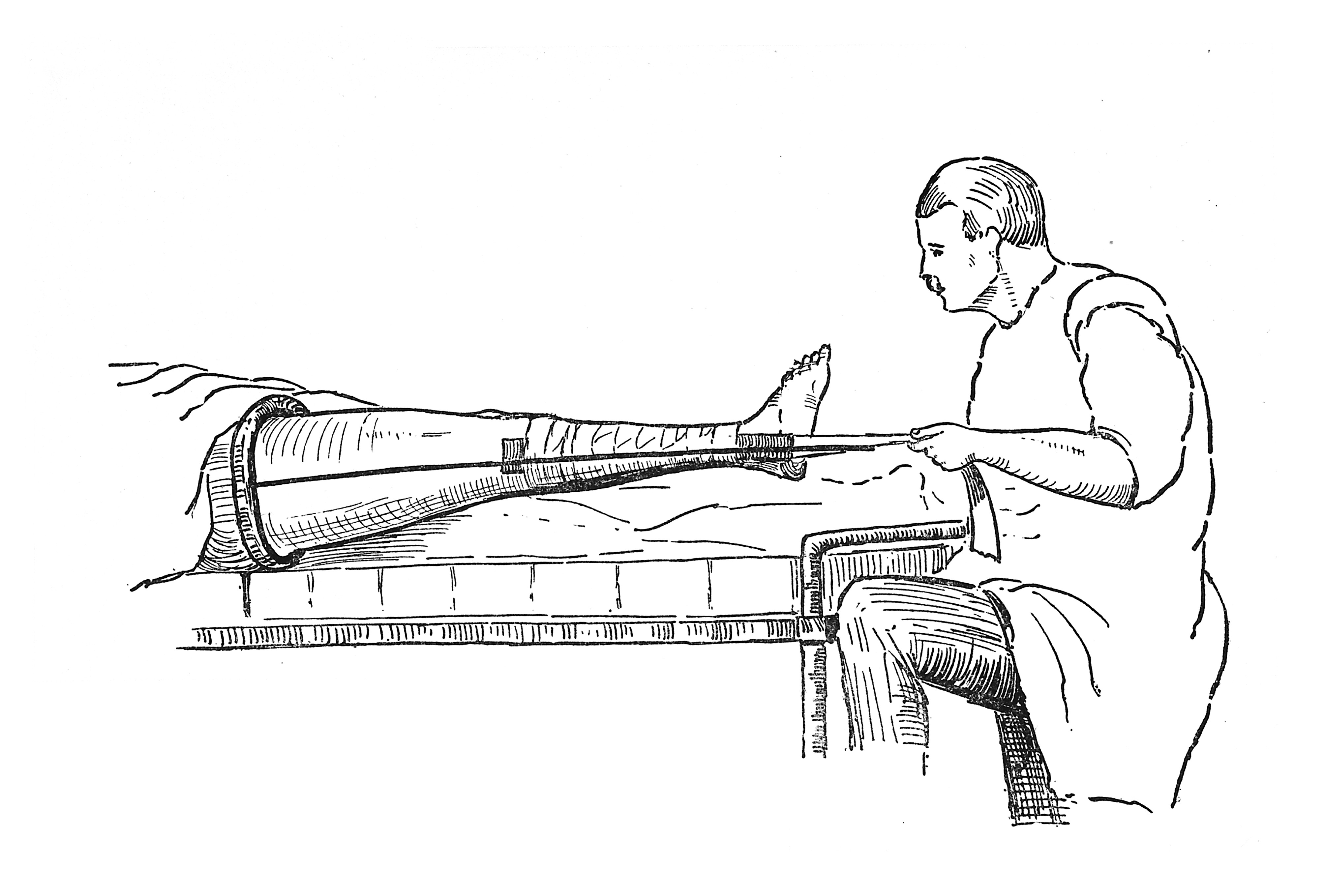 The application of Thomas’s splint, for fractures of the femur and leg bones.