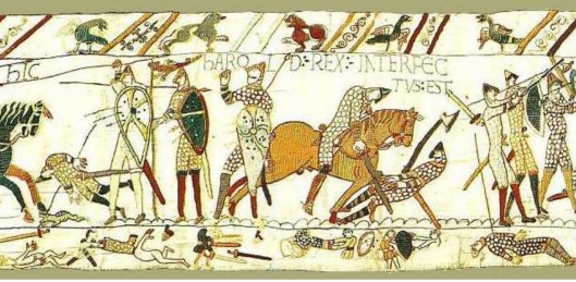 Es una escena de la batalla de Hastings, que se libró en 1066 y que tiene gran importancia en la Historia europea, puesto que supuso la ascensión al trono de Inglaterra del normando Guillermo el Conquistador. Los que hayan visto alguna película clásica de Robin Hood o de Ivanhoe recordarán que suele mencionarse a una sociedad dividida entre una aristocracia normanda dominante y unos sajones subyugados. Pues bien, los normandos eran dominantes porque Guillermo ganó esta batalla, derrotando al rey Harold (Haroldo II en castellano). De haber sido otro el resultado, los sajones habrían sido los dominantes y los normandos… no estarían dominados porque se habrían tenido que volver a Normandía.