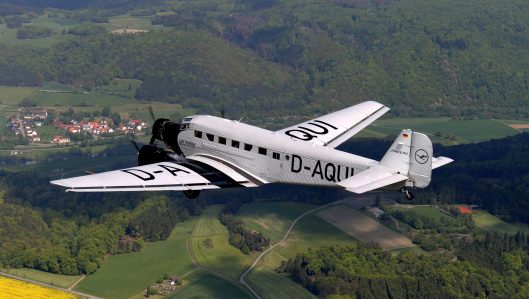 La aeronave en cuestión era uno de los aviones más reconocibles que han existido: un trimotor Ju-52/3m (3m quiere decir 3 motores y se incluye en la denominación porque los primeros prototipos eran monomotores). Su silueta es familiar no sólo para los aficionados a la aviación sino para todo aquél que haya visto un documental de la Segunda Guerra Mundial. ¿Quién no ha visto una foto parecida a la siguiente?