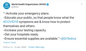 Sobre ese mismo tema se insistía el 5 de marzo. La OMS pedía que se activaran los planes de emergencia en cada país, se divulgara información al público para que conocieran los síntomas y supieran cómo reducir el riesgo de contagio, se incrementara la disponibilidad de tests para detectar quiénes estaban infectados, se preparara a los hospitales para la situación y se garantizara la existencia de equipos adecuados.