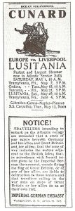 Los incidentes eran cuestión de tiempo, y el más conocido fue el del Lusitania: un buque británico de pasajeros torpedeado y hundido en mayo de 1915 cuando hacía la travesía entre Nueva York y Liverpool. Hay que decir que además de pasajeros llevaba municiones y que la embajada alemana había puesto anuncios en la prensa de Nueva York avisando a los pasajeros del riesgo que corrían, como vemos en la imagen, que he obtenido de Wikipedia. Aun así, torpedear un buque con civiles norteamericanos a bordo, era un casus belli inevitable. O casi inevitable, porque Wilson estaba decidido a mantener la neutralidad. Naturalmente, hubo protestas diplomáticas, declaraciones altisonantes, amenazas… pero los Estados Unidos no entraron en la guerra. Todavía no. En septiembre de 1915 Alemania se comprometió finalmente a no atacar buques de pasajeros sin aviso previo y la crisis pareció desactivada.