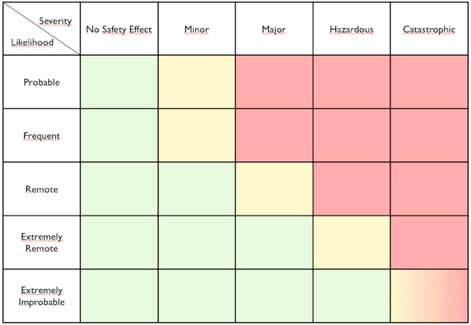 Veamos un ejemplo en el que aplicaremos la tabla a un motor de aviación. El fabricante nos dará todos sus parámetros, por lo que sabremos la probabilidad de que haya una pérdida de potencia. Lo peor que puede ocurrir es que ese caso se dé justo en el momento en el que el avión está en carrera de despegue y rotando, es decir, empezando a levantar el morro. Como las normas obligan a que el avión sea capaz de despegar aunque tenga un motor parado el caso no sería catastrófico, aunque sí muy grave. Si la fiabilidad es tal que el caso es extremadamente improbable la casilla es verde y podemos usar ese motor, pero si nuestro motor no es tan fiable y el caso entra en lo extremadamente remoto la casilla amarilla implica que tendremos que someterlo a vigilancia: por ejemplo obligando a guardar en cada vuelo un registro de determinados parámetros, para su análisis posterior. Si el motor es tan poco fiable que el fallo entra en lo remoto, probable o frecuente el color rojo deja claro que su instalación es inaceptable por motivos de seguridad.